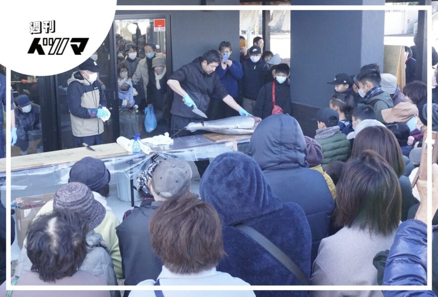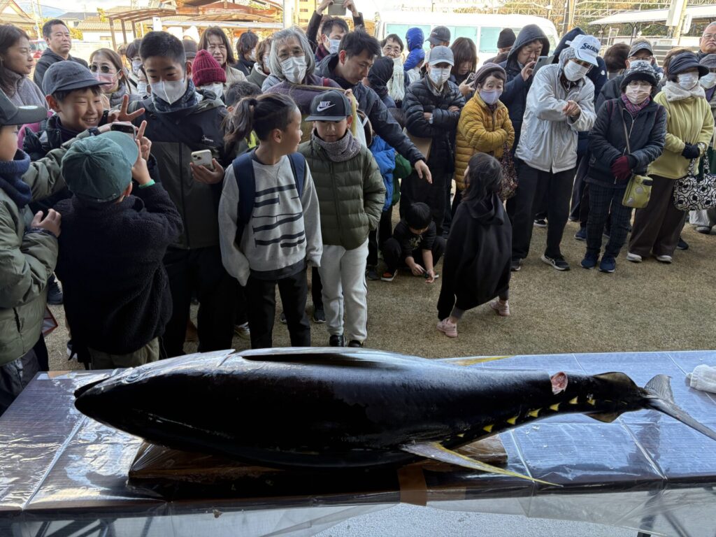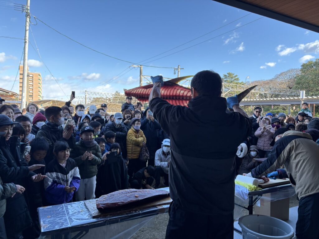 昨年4月から、毎月第2日曜日に高鍋駅で、高校生・高鍋町観光協会と企画・開催している「月市」、2026年のスタートは、「月市」出店者、地元の杉田鮮魚店さんが30kgのマグロを解体!捌き立てのマグロ100食を振舞いました。
