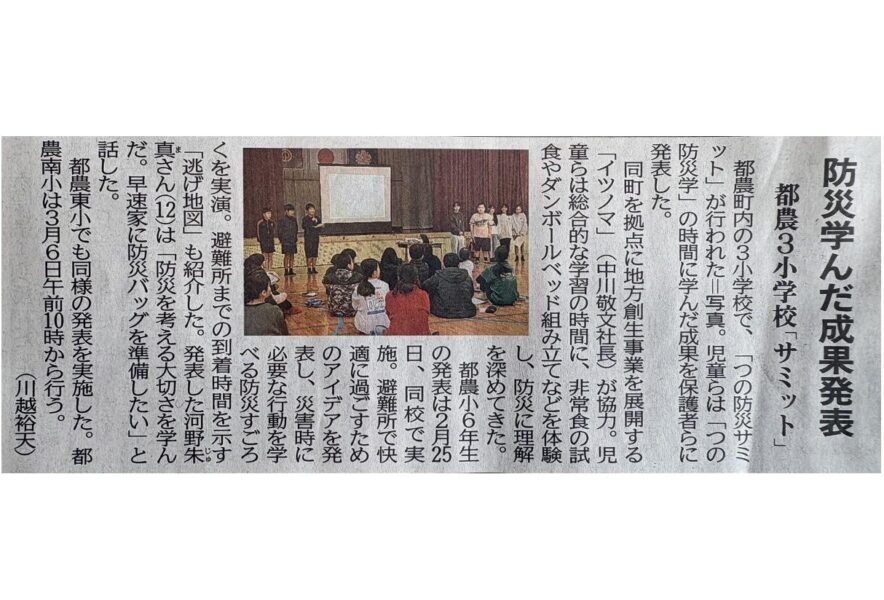 今年度、イツノマが都農町からの委託を受け、都農町内3小学校6年生を対象に、各校の総合的な学習の時間で15時間かけて学び合ってきた「つの防災学」成果発表が掲載されました。