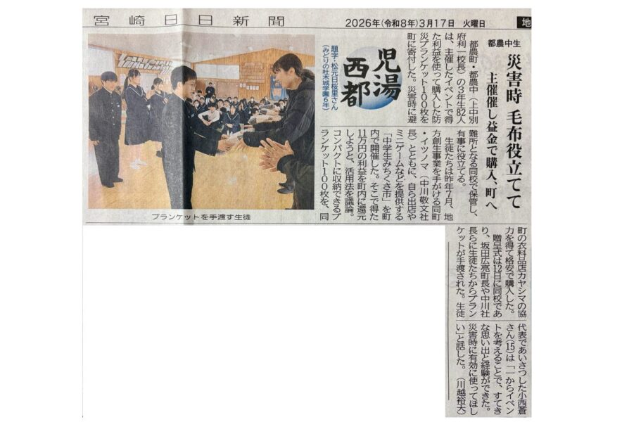 宮崎日日新聞で、都農中学校3年生が「みちくさ市」の益金で町にブランケット100枚を寄付した贈呈式が掲載されました。